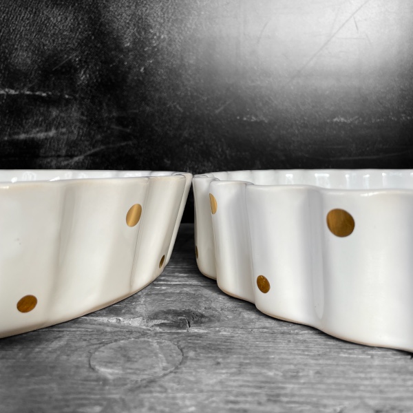Glineni BELI pitičniki so ročno izdelani v Sloveniji in ozaljšani s pravim zlatom. Premazani so z glazuro primerno za stik z živili.